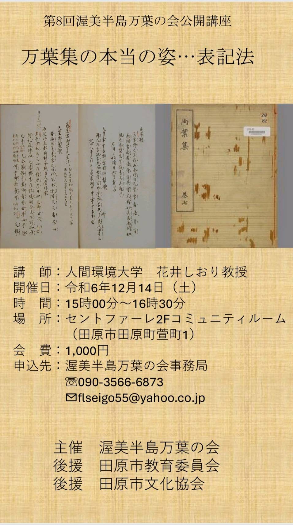 こうご期待!万葉集公開講座 万葉集 2024.11.30 来たる12月14日に渥美半島万葉の会が開催されます。花井しおり教授によるお話を聞く事ができる公開講座です。 今回のテーマは「万葉集の本当の姿・・・表記法」です。