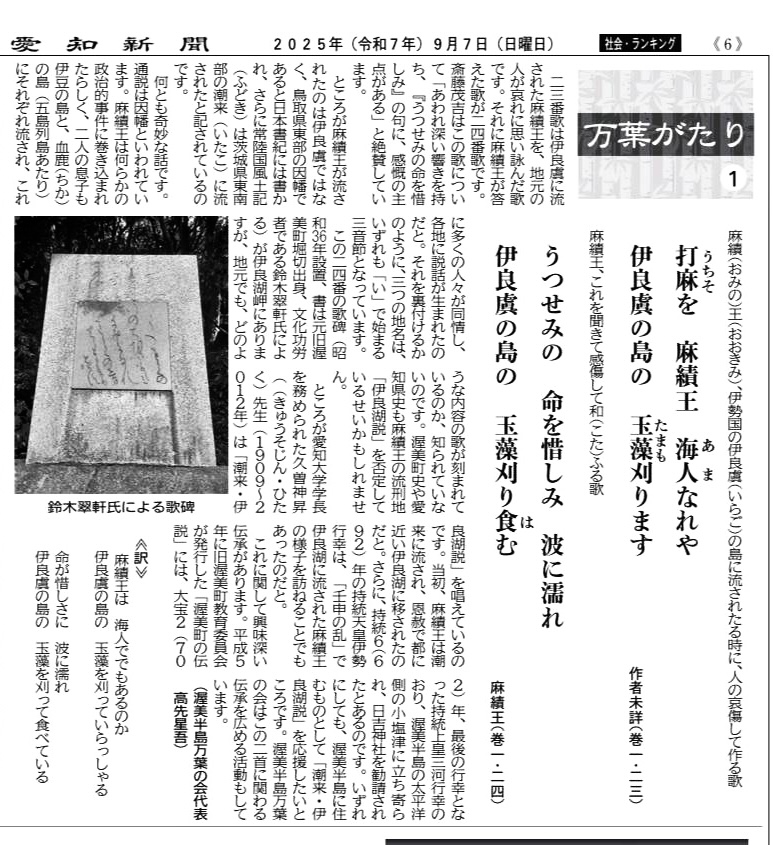 万葉集万葉集について学び楽しむ一般の人たちの手による万葉集の話を掲載する、東愛知新聞紙上の「万葉がたり」の掲載がいよいよ始まりました。
